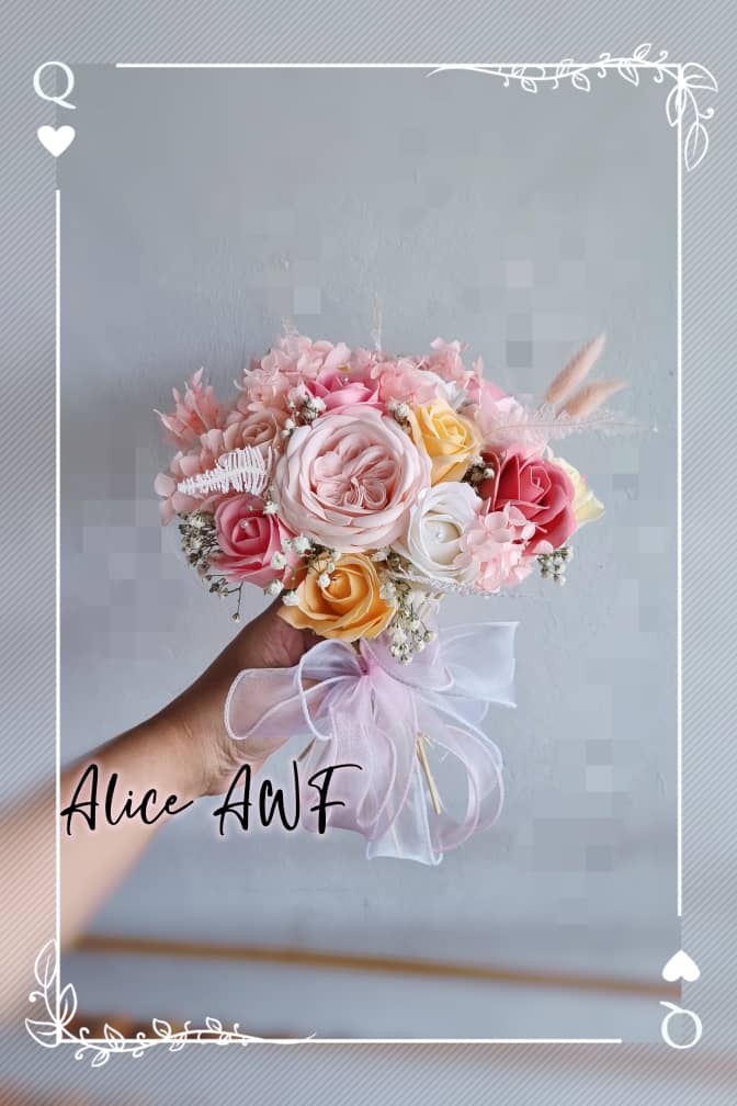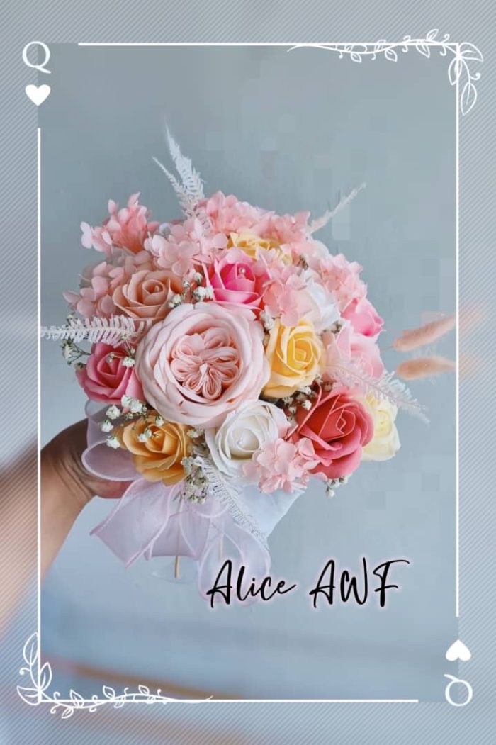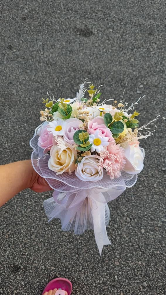 Soap roses with artificial flowers, artificial leaves, and dried flowers.